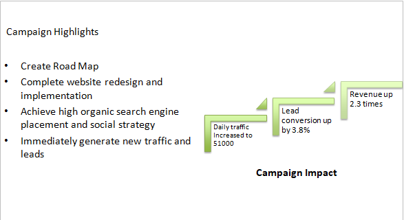 As a result of our initial strategy and implementation, their daily traffic went up to 52000 from a mere 4000, Their revenue increased 2.3X and the lead conversion percentage went up to 3.8%